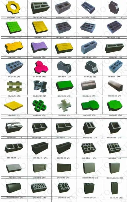 Les dimensions des briques permettent de distinguer les machines à briques : machine à fabriquer des blocs creux, machine à fabriquer des blocs pleins, machine à fabriquer des pavés, machine à fabriquer des briques à emboîtement.